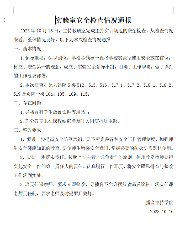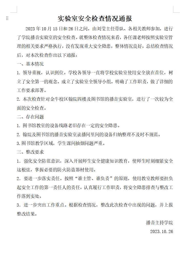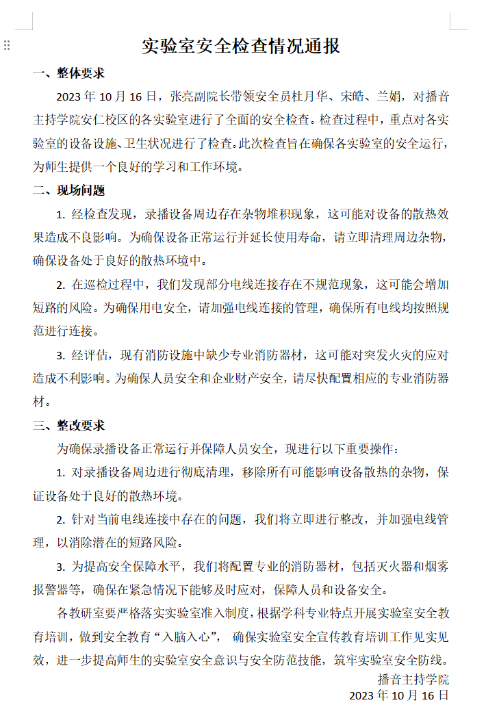 2023年10月实验室安全检查情况通报