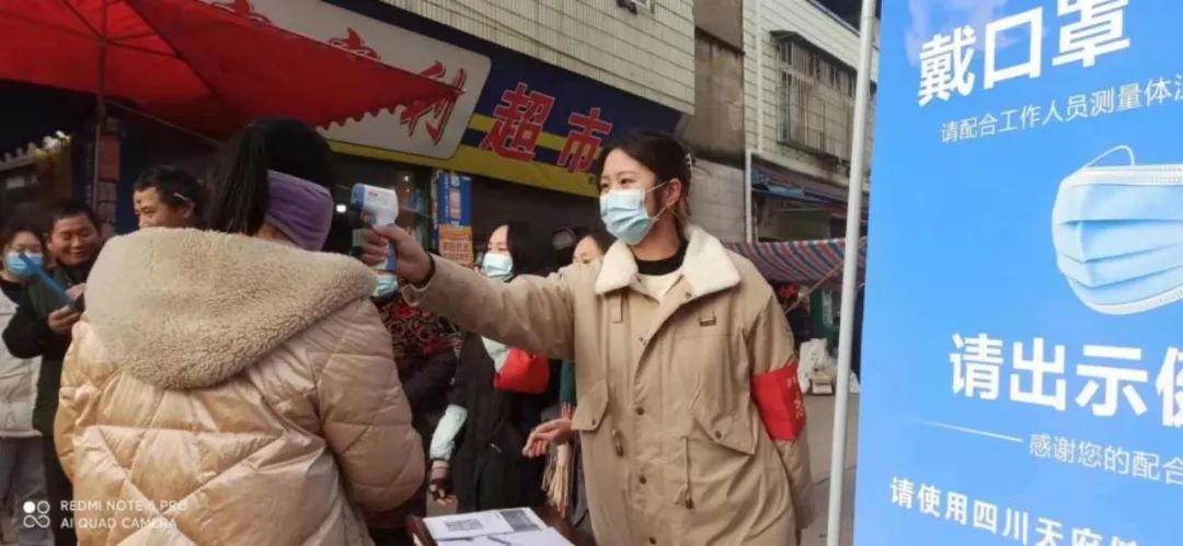 赶集时人员很容易聚集,而且都是来自四面八方的居民,所以疫情防控尤为重要。作为一名党员的我义不容辞的选择参加了此次疫情防护志愿者的工作,我的工作就是站在市场入口提醒大家戴好口罩,量体温做好登记,为大家筑起坚实的防疫堡垒。