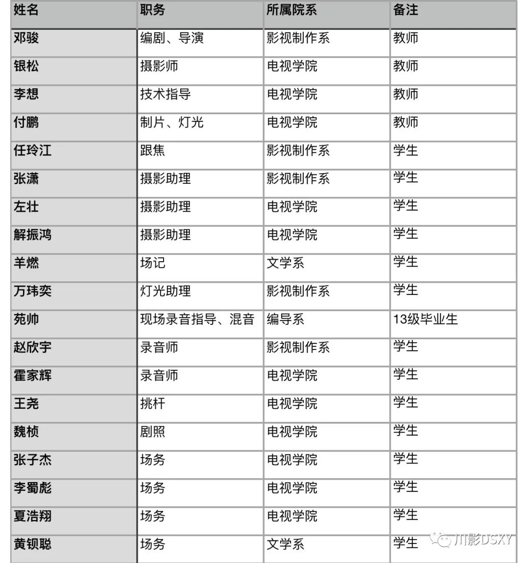 本次邓俊老师带领的短片拍摄实践,有别于传统的学生短片创作模式,采取了跨院系联合制作的方式,由电视学院、影视制作系牵头,文学系参与,得到了学校领导的高度重视与支持,表现出了川影的艺术创作氛围是至上而下的,充分体现了川影作为一所应用型本科院校对师生艺术实践中教学特色创新的重视。