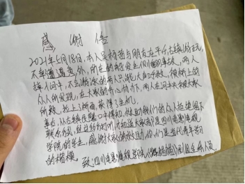 因为这些勇敢的施救者不愿留下姓名,吴杨茜小姐姐特地去找到警方了解到,帮助她的人是我校电视学院20级戏导2班《躲猫猫》剧组的全体成员,事发当时剧组正在拍摄,于是她特地去做了一面锦旗想亲手交给同学们,表达心中的感激之情。