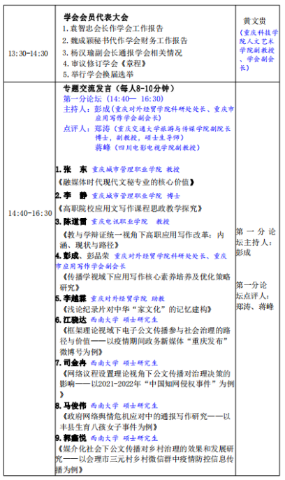 据悉,中国应用写作与传播学术论坛旨在进一步推进应用写作、公文写作与传播的课程建设和学科建设,推进公文写作与社会学、传播学的交叉研究。本次会议中,重庆市应用写作学会会长袁智忠教授对学会的发展作出了前瞻性的展望,明确指出重庆市应用写作学会将继续本着“研究学术、服务社会、推进进步”的理念,同会内会外专家、学者一起把应用写作学、公文写作学、公文传播学的研究落到实处,为社会治理与社会发展以及中国式现代化作出应有的贡献。