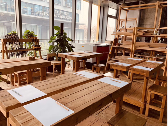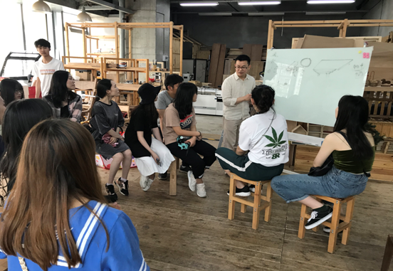 积木工坊创办于2016年,经过3年的不断发展成为一家成熟的能够为客户提供多种木工设计与制作的体验木工坊。具有安全精密的进口设备及手工工具,满足各种工艺需求。康夫老师给同学们先介绍了木工坊的大致情况,在所有的模式里,强调体验是必须要有的。这对于都市人群来说是一个低门槛的木工感受机会,同时也是木工坊与市场融合的有效窗口。另一方面,积木工坊也是大学生做毕业设计的地方。这在一个并不以木工文化为底蕴的都市里的确是为这些学生提供了一定便利。同时把木工工坊和企业团建之间的通道打通了。