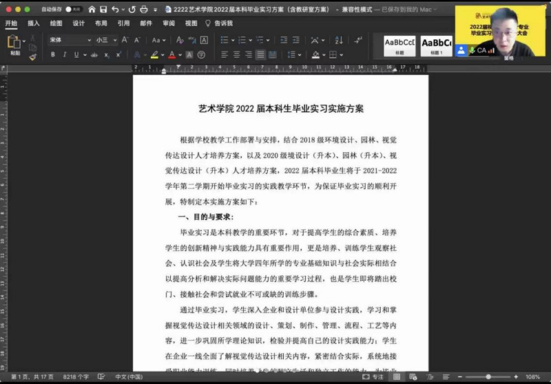 其后,弘雅书院王友峰院长反复强调毕业实习安全问题,严格按照国家和学校要求做好疫情防控。针对毕业实习安全注意事项进行10项温馨提示;实习整体时间安排;以及在后疫情时代激烈的竞争环境下先就业再择业的就业方案;实习单位遵循就近原则,原则上不出河南省,实习单位应与视觉传达设计专业相近。张鹏院长旁征博引,重点讲述了在实习技能不足的前提下实习认识的转变与心态调试,鼓励毕业生树立正确的就业观,毕业实习和毕业论文(设计)是同学们完成大学学业的最后一个重要环节,落实就业岗位是同学们面临的当务之急。张鹏院长对毕业生提出殷切希望:一、虚心学习,学以致用;二、树立正确的就业观,在实干中锻炼自己、成就自我。