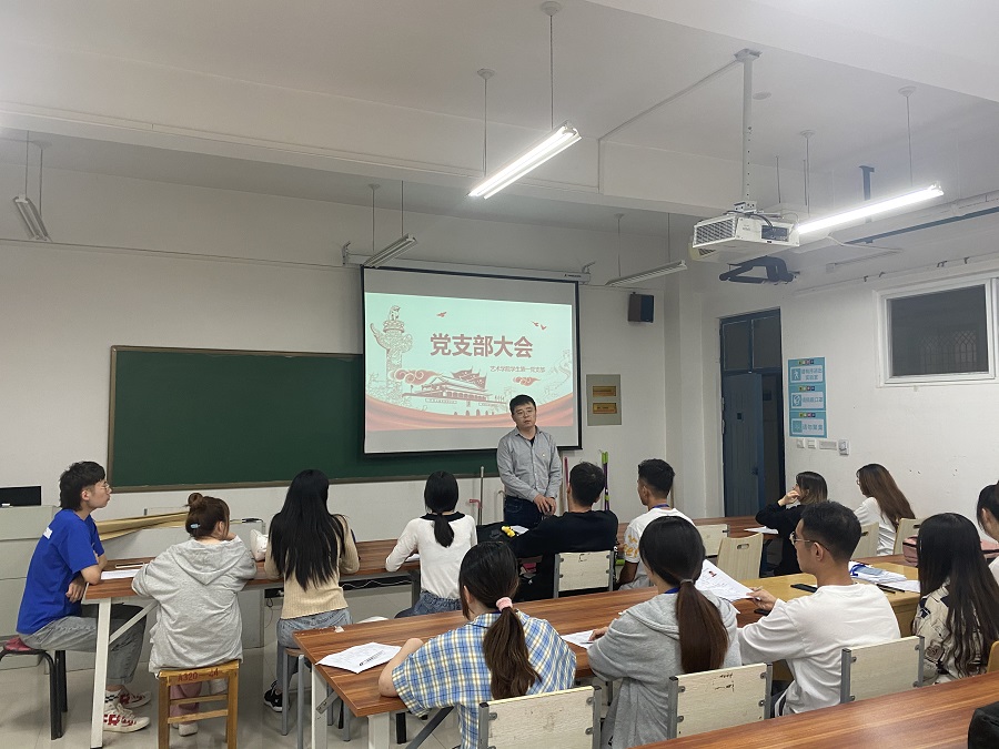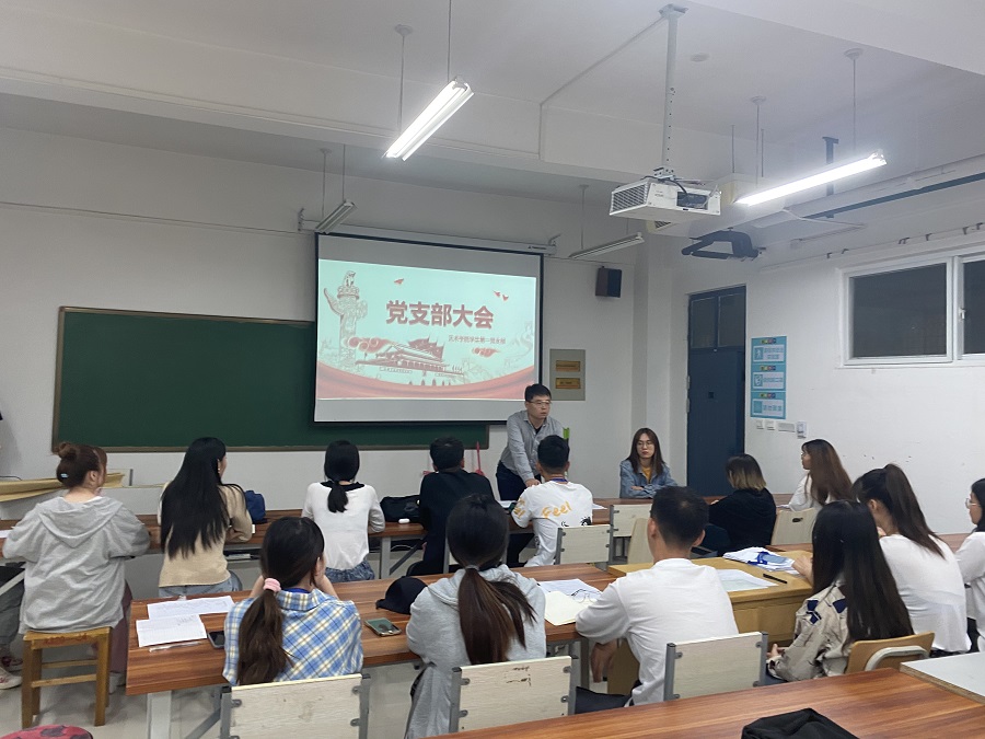 首先韩飞老师介绍了因升本入学新加入我支部的八位党员同志,他们分别来自于环境设计专升本班以及视觉传达专升本班。