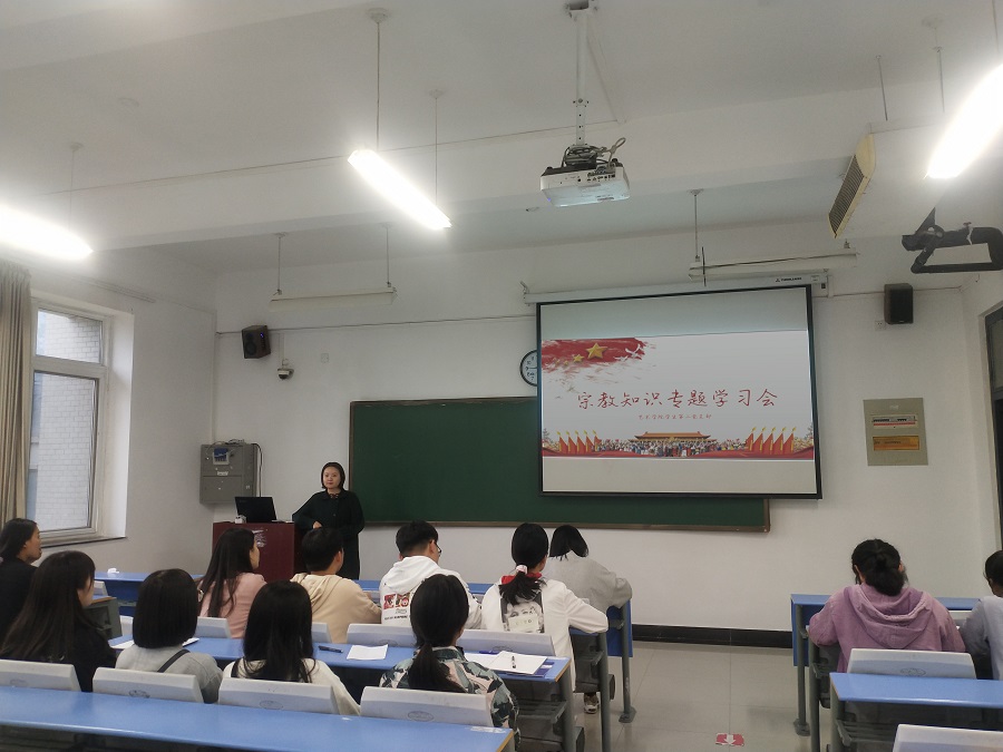 为进一步加深党员同志对我国宗教政策的理解,促进全体党员树立正确的宗教观和学法遵法守法用法意识,提高学生认识和对待宗教问题的能力,2020年10月2日,bat365正版唯一官网学生第二党支部在二号教学楼B301举办了宗教知识专题党课。党支部书记卢晓靖老师、组织委员孟星星老师以及二支部全体学生党员参加了此次会议,党课由卢晓靖老师主讲。