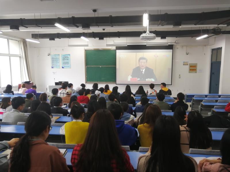 当天中午,bat365学生干部和团员代表聚集在教学楼合404教室,第一时间集体观看学习了习近平总书记重要讲话精神。团总支负责人韩飞老师参加了此次学习活动。