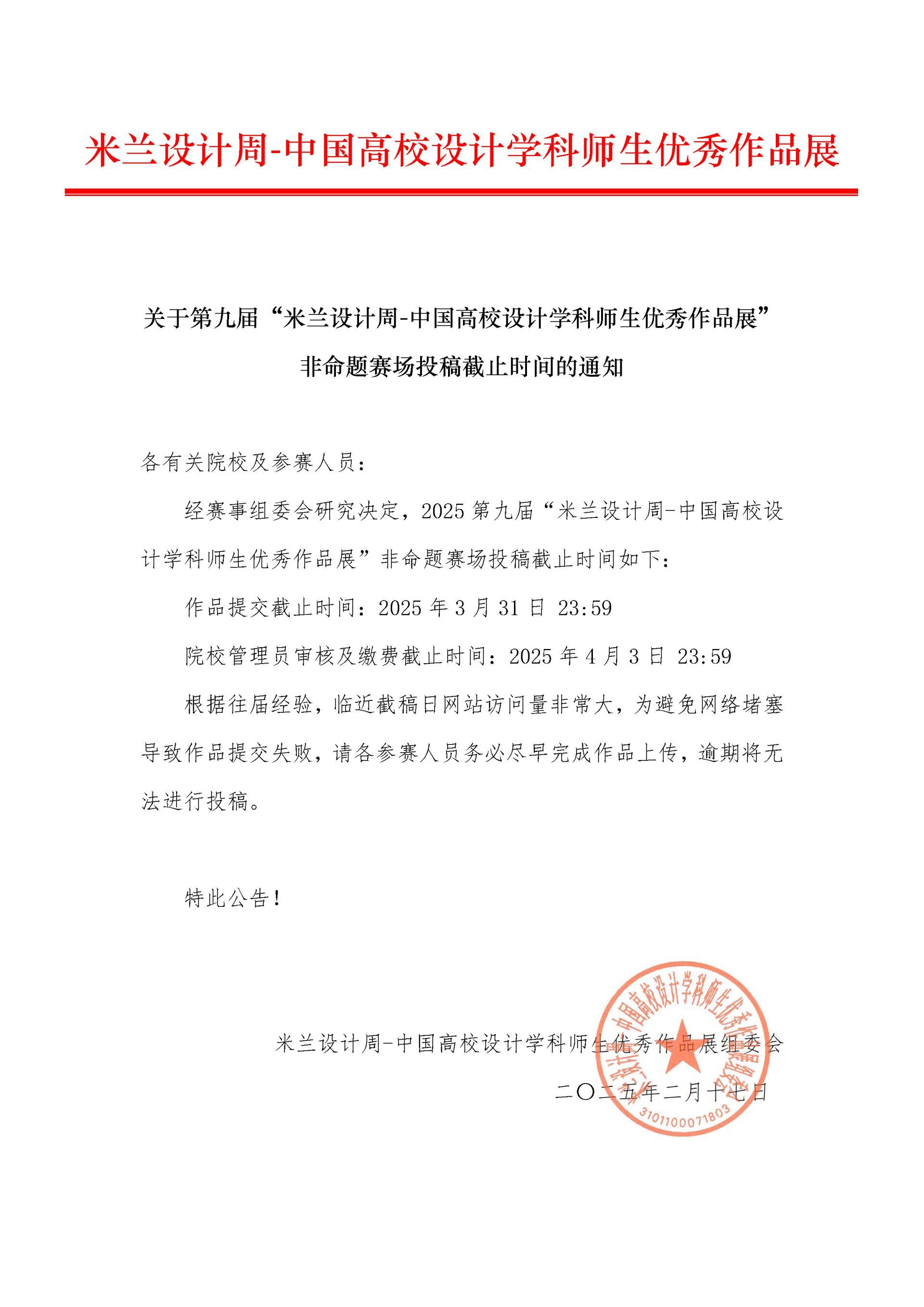 关于第九届“米兰设计周-中国高校设计学科师生优秀作品展”非命题赛场投稿截止时间的通知