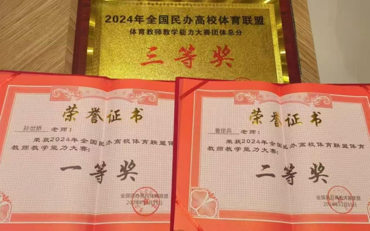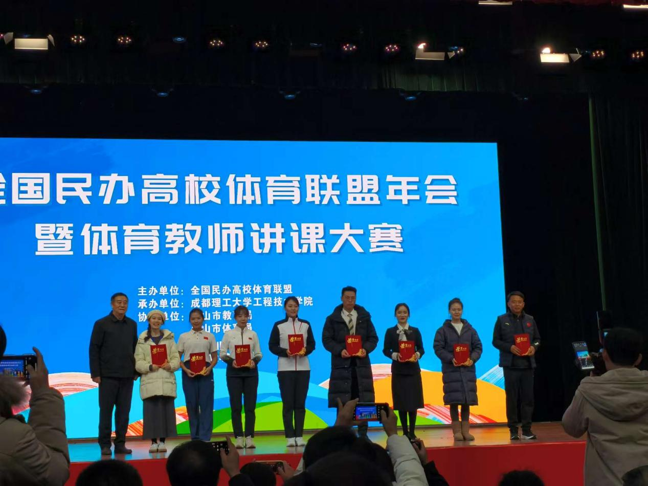 2024年12月13日—15日,由全国民办高校体育联盟主办,成都理工大学工程技术学院承办的全国民办高校体育联盟年会暨体育教师讲课大赛在成都理工大学工程技术学院举行。本次比赛吸引了全国58所民办高校的192名教师参加。我校选派出孙世娇、曹定兵两位老师由蔡小林老师带队参加本次比赛。经过近两天的激烈角逐,孙世娇老师获得体育术科组个人一等奖,曹定兵老师获得体育术科组个人二等奖,学校获得集体三等奖。