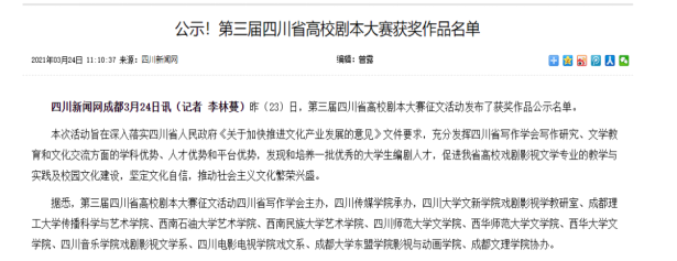 在2021年第三届四川省高校剧本大赛比赛中,电影学院戏剧影视文学专业学子荣获比赛二等奖、三等奖以及优秀奖的佳绩!