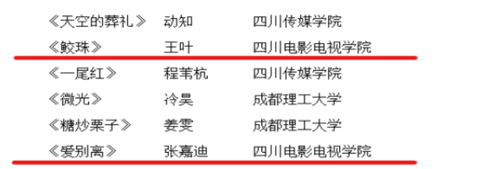电影学院戏剧影视文学专业学子王朝阳的《海上牢笼》,代晨的《锦绣双城》,刘晓庆的作品《追凶》,刘淑婷的《莫琪》,李嘉伟的《漂泊的你》,武小婷的《莉莉的犀牛》,王紫庆的《新婚》和戴佛娜的《以你之名》(以上均为原创电影剧本)在第三届四川省高校剧本大赛中取得优秀奖的好成绩!
