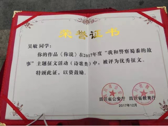 例如,在2017年度“我和警察蜀黍的故事”主题征文活动(诗歌类)中,2015级吴敏同学的作品《你说》荣获优秀征文称号;