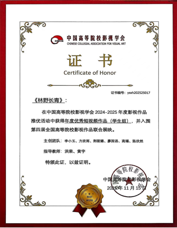 凭借对林业发展的深度诠释与精湛影视表达,作品《林野长青》成功入围高校影视学会!荣获“年度优秀短视频作品(学生组)”称号。这一荣誉的背后,是十位创作者深入山林,实地拍摄和细致打磨的匠心之作。