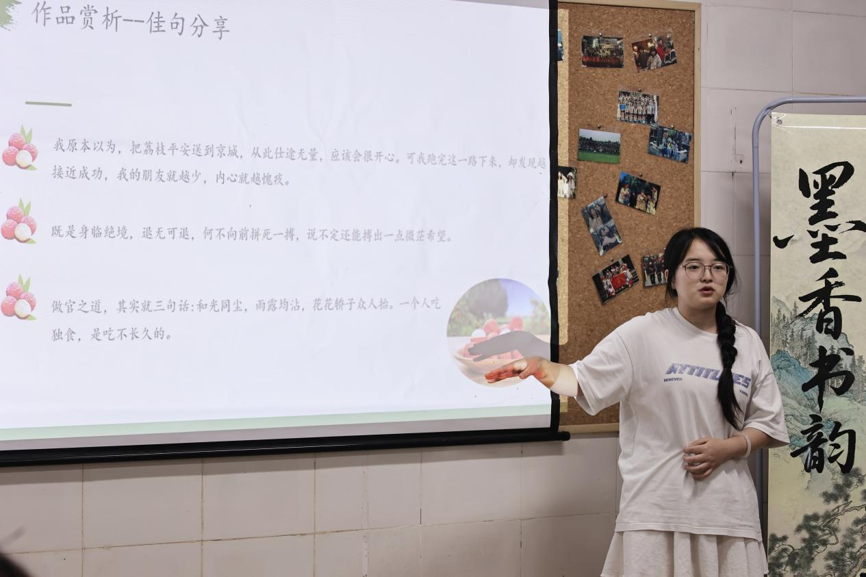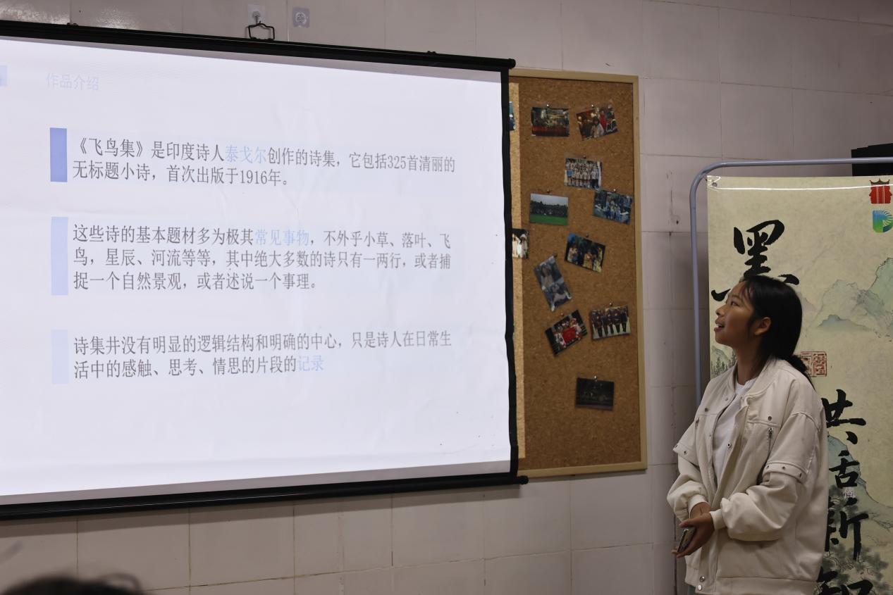 王佳顺同学则通过《飞鸟集》展开诗意对话,选取泰戈尔“生如夏花”等经典隽语,结合现代青年生活困境,剖析诗歌中蕴含的生命哲学,引发师生对存在价值的多元思考。