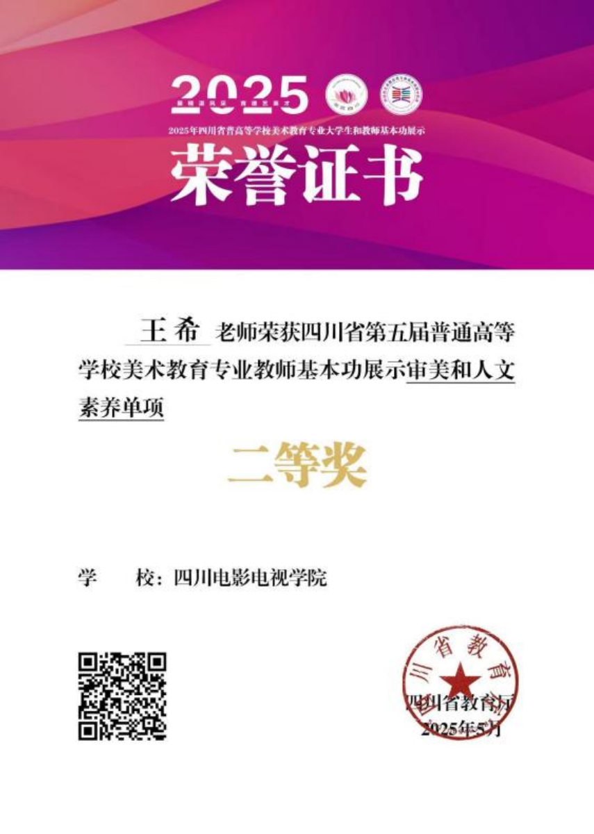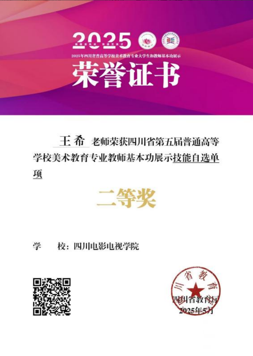 荣获四川省第五届普通高等学校美术教育专业教师基本功展示技能自选与审美和人文素养二等奖。