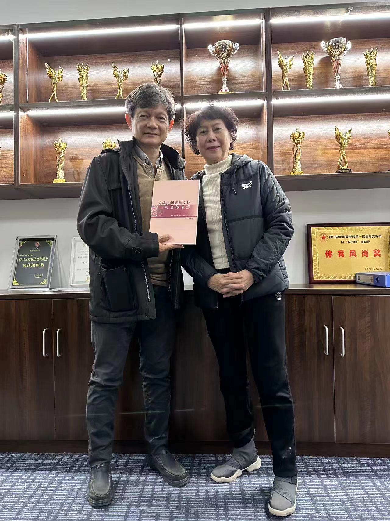 陈志惠院长将自己编写的舞蹈教材《羌族民间舞蹈女班教材》、《羌族民间舞蹈文化与身体表意》以及教学光盘赠送给了曹诚渊教授,并代表学院师生对曹诚渊教授表示了衷心的感谢。