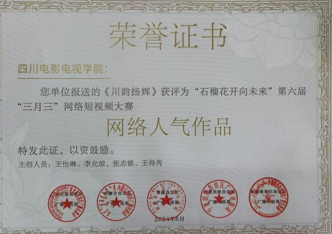 《川韵扬辉》获国家广播电视总局网络视听节目管理司、广西党委宣传部指导的第六届网络视频大赛网络人气作品奖;