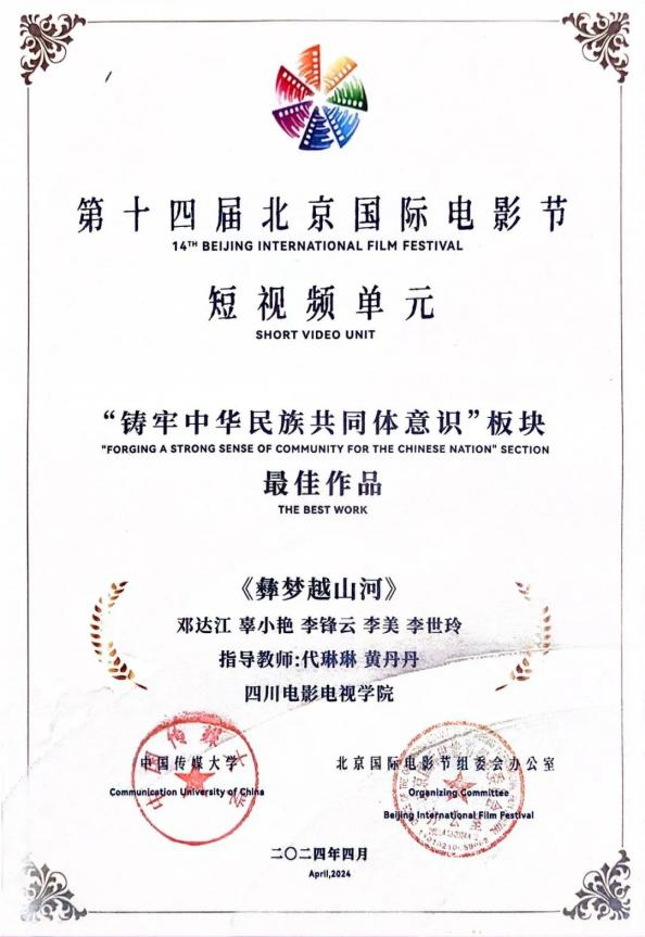 《彝梦越山河》获第十四届北京国际电影节短视频单元“铸牢中华民族共同体意识”最佳作品;四川省广电局2024“神秘蜀韵 百部川扬”年度优秀作品