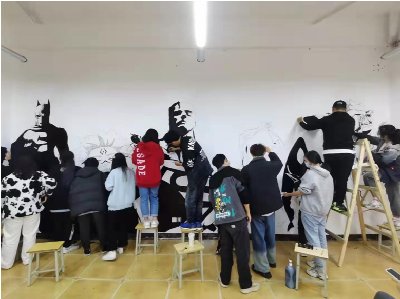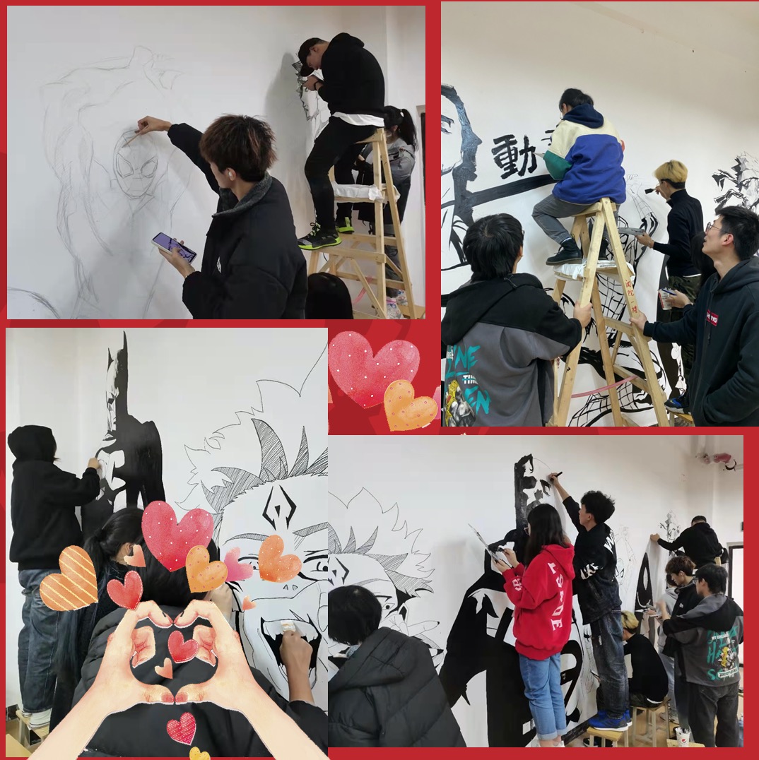 在川影校庆时,动画教研室的同学们就曾为校献礼,装点美丽校园,进行“涂鸦墙”艺术创作。有过之前的墙绘经验,此次活动,同学们配合更加默契,将课堂上所学的插画设计及装饰绘画设计活学活用,不仅让学习的环境更具艺术气息,有趣的墙绘涂鸦也记录下同学们的大学时光。一起回顾欣赏下动画专业同学们的墙绘作品: