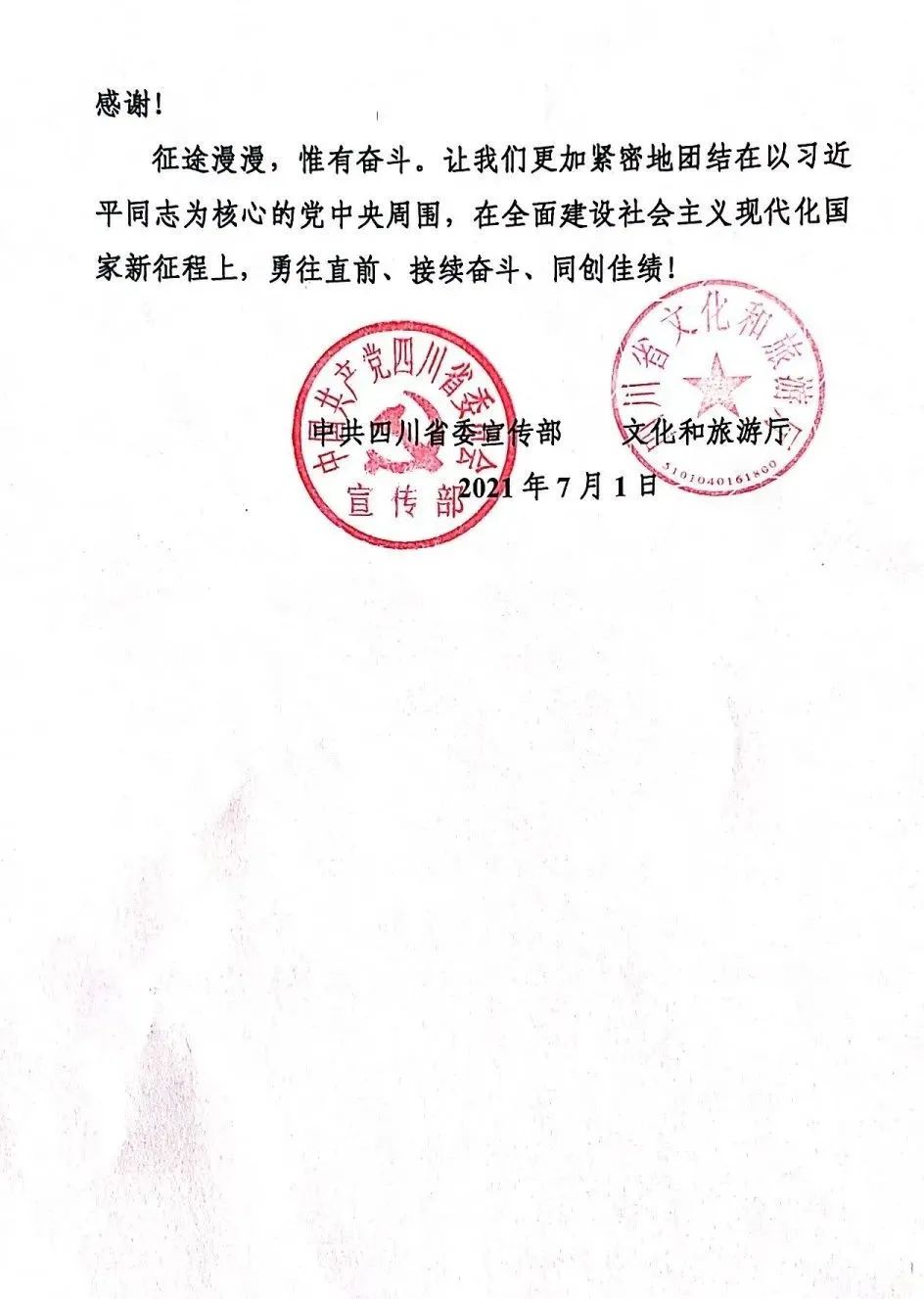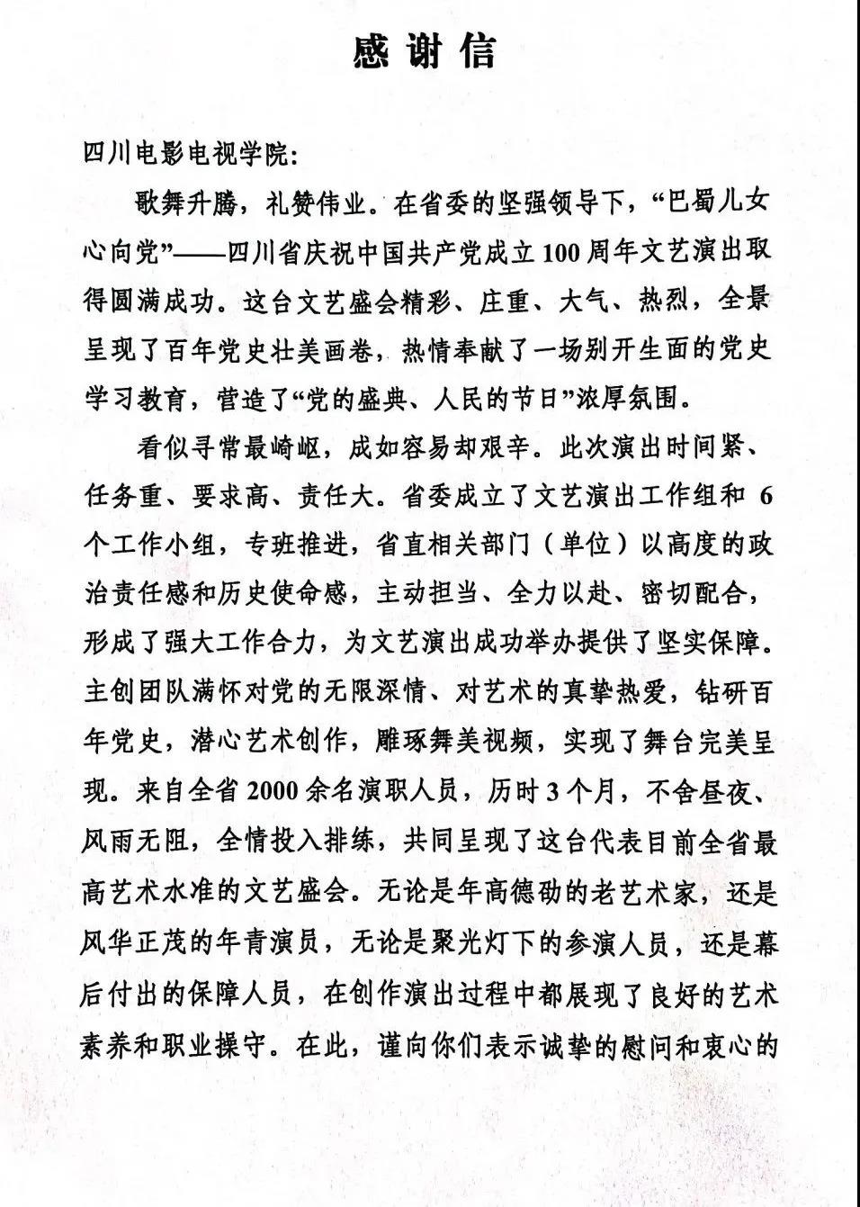 歌舞升腾,礼赞伟业。近日,川影因出色完成四川省庆祝中国共产党成立100周年文艺演出——“巴蜀儿女心向党”,收到来自中共四川省委宣传部、文化和旅游厅发来的感谢信。