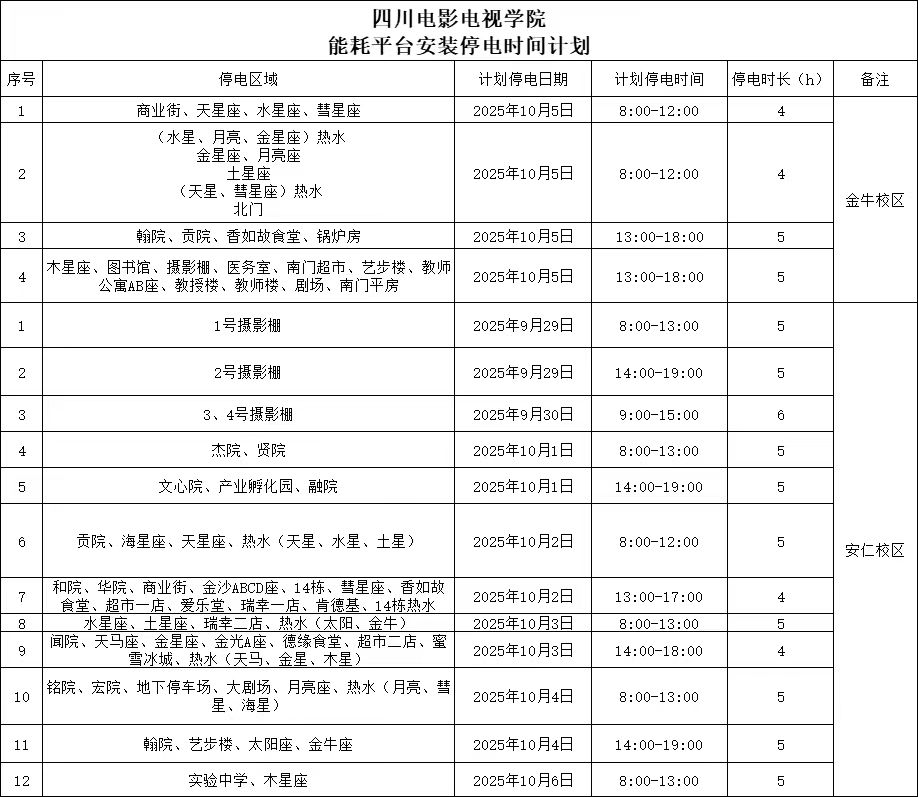 为了加强用电安全管理,学校计划于2025年9月29日——10月6日分区域分时段停电安装电力监测仪等设备,具体安排见下表: