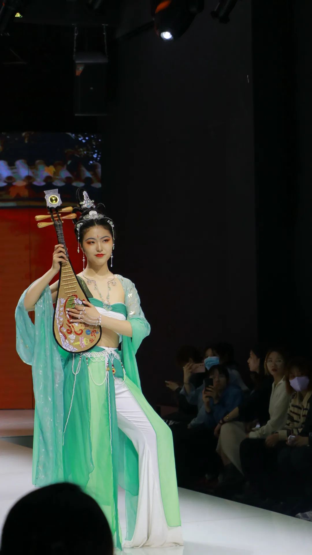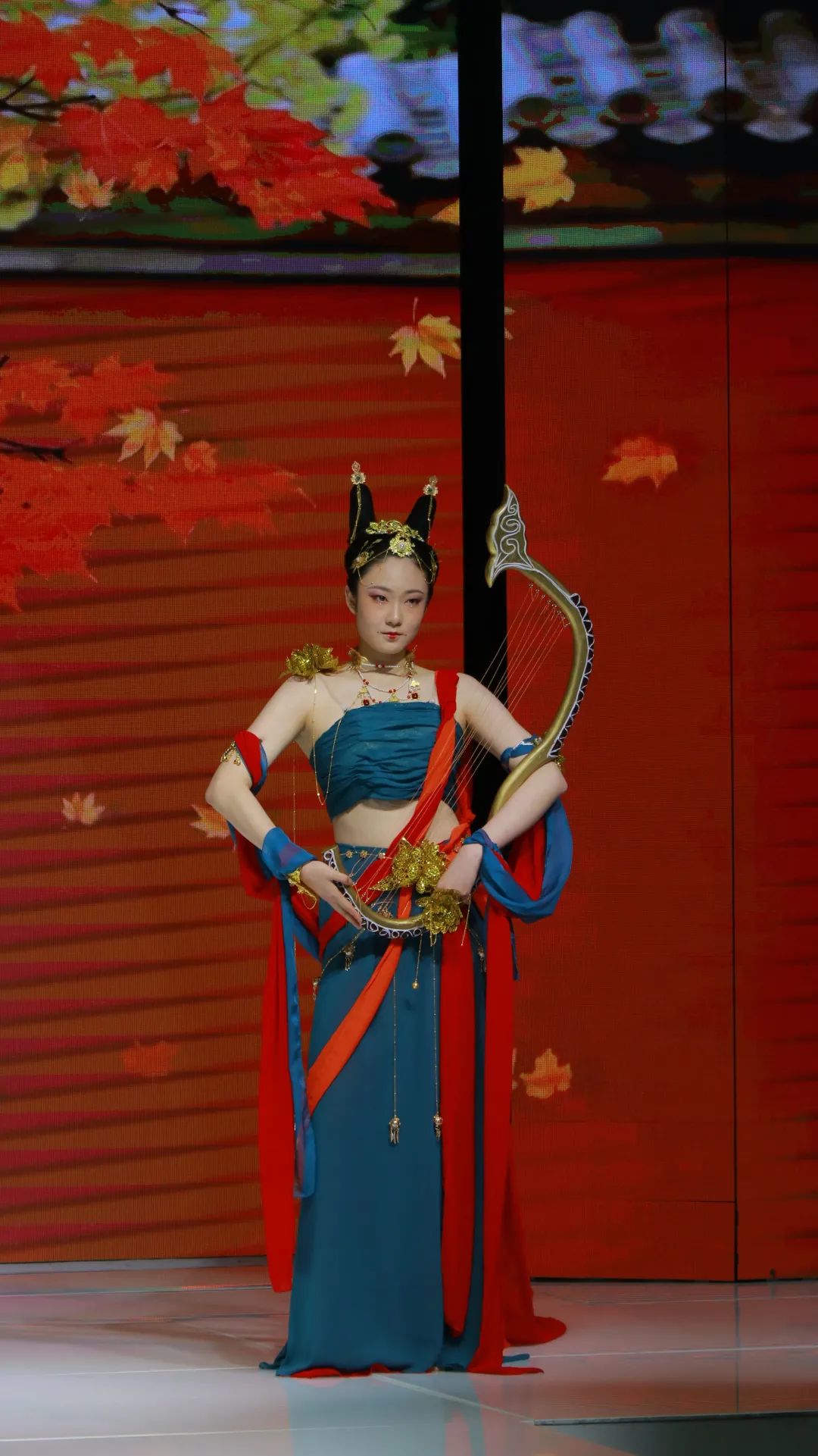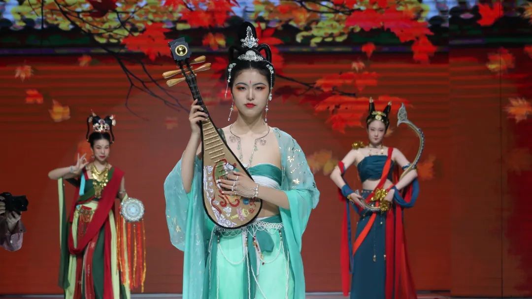 最后出场的是敦煌组的3套作品。服装完美复刻了敦煌壁画的配色,手中的乐器道具纹样繁复,充满了敦煌风格,腰间、手腕的手工配饰处处透露着参赛同学的巧妙心思。