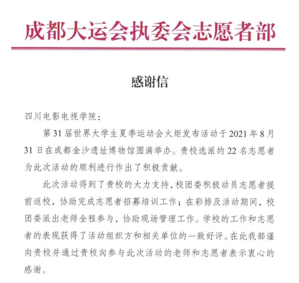 成都第31届世界大学生夏季运动会火炬“蓉火”,近日在成都金沙遗址博物馆正式对外发布。澳门网投唯一官网56名志愿者参与发布仪式,担任礼仪、现场接待、活动指引等工作,积极贡献,展现青春活力,为此,成都大运会执委会志愿者部向我校发来了感谢信。