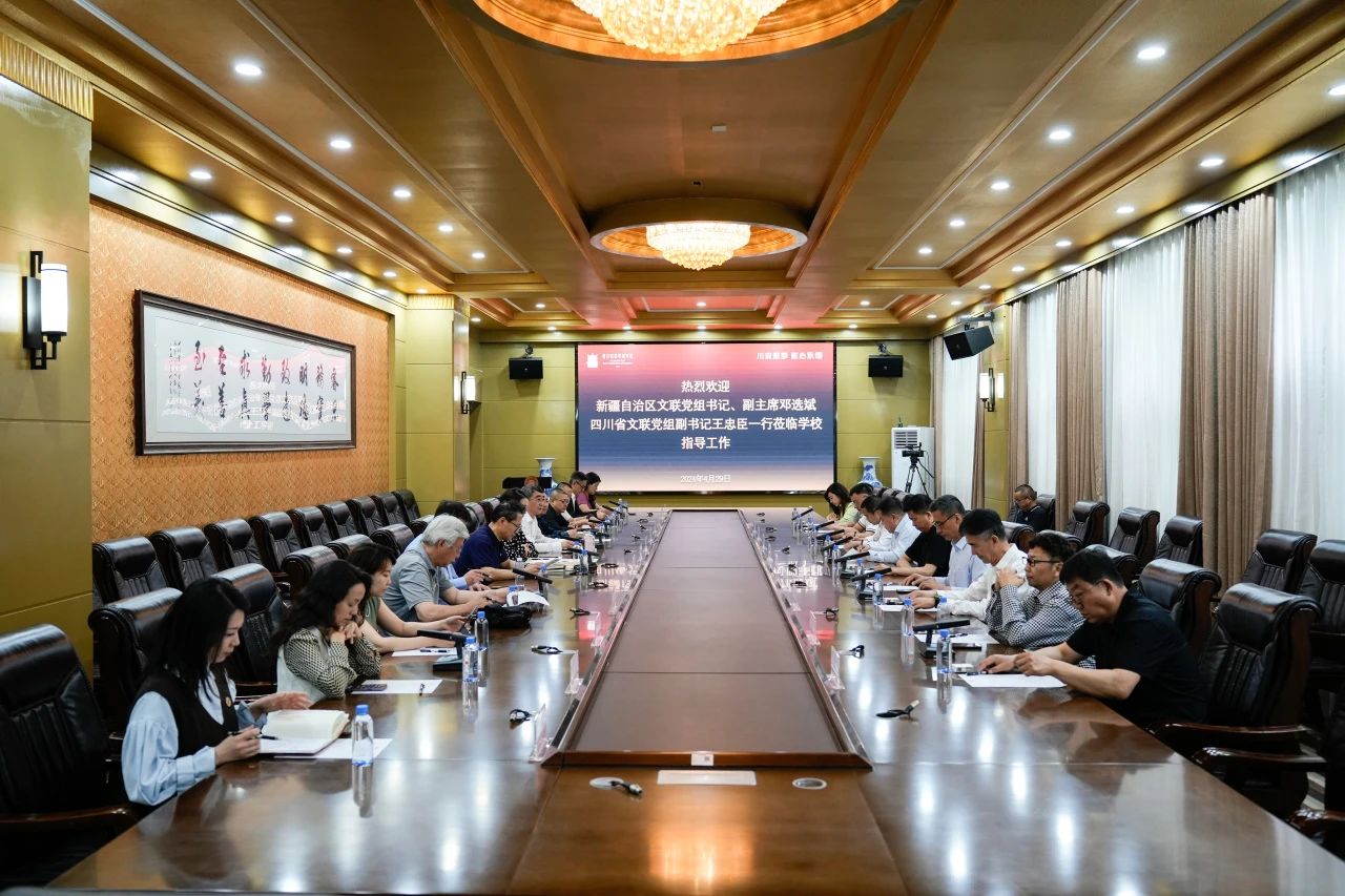 4月29日上午,新疆文联党组书记、副主席邓选斌,办公室主任、一级调研员朱鹏宁,权益保护部部长、一级调研员章新军,摄影家协会副主席周小强,美术家协会副主席孙新海,音乐家协会副主席陈子文,书法家协会秘书长杨晓刚,以及四川省文联领导一行,来到川影安仁校区,在校长、党委副书记罗思,党委书记王小林,副校长于世祥等校领导及相关负责人的陪同下考察调研,并进行座谈交流。