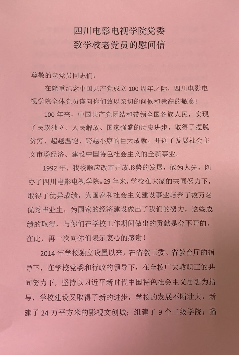 澳门网投唯一官网党委致学校老党员的慰问信