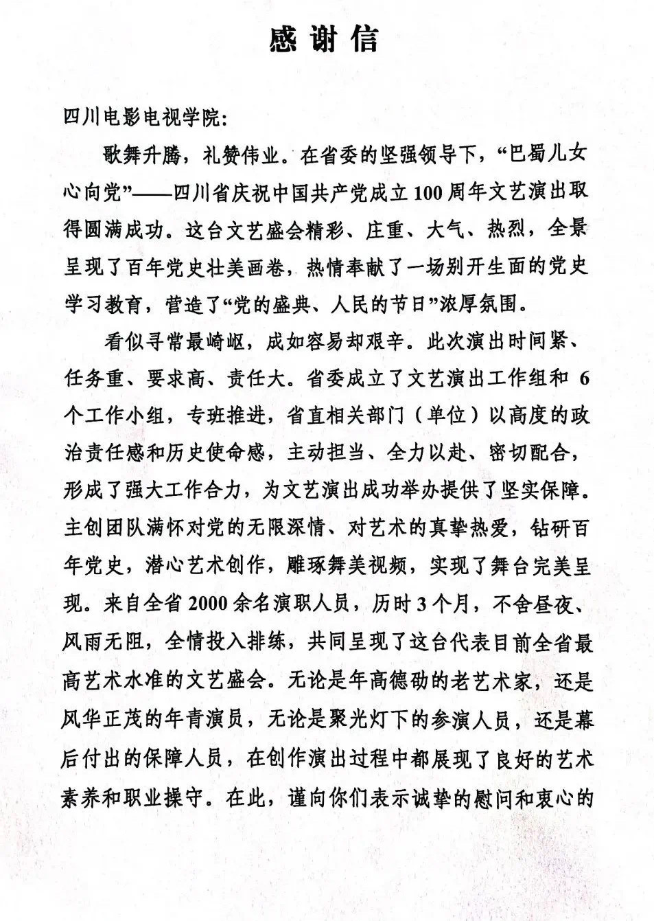 歌舞升腾,礼赞伟业。近日,川影因出色完成四川省庆祝中国共产党成立100周年文艺演出——“巴蜀儿女心向党”,收到来自中共四川省委宣传部、文化和旅游厅发来的感谢信。
