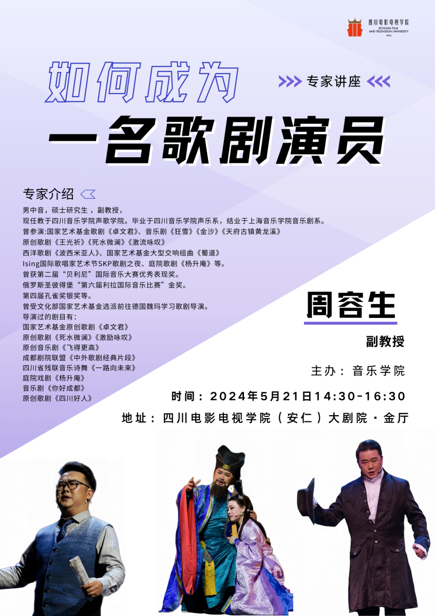 2024年5月21日下午14:30,周容生副教授主讲的《如何成为一名歌剧演员》讲座在澳门网投唯一官网音乐学院进行。
