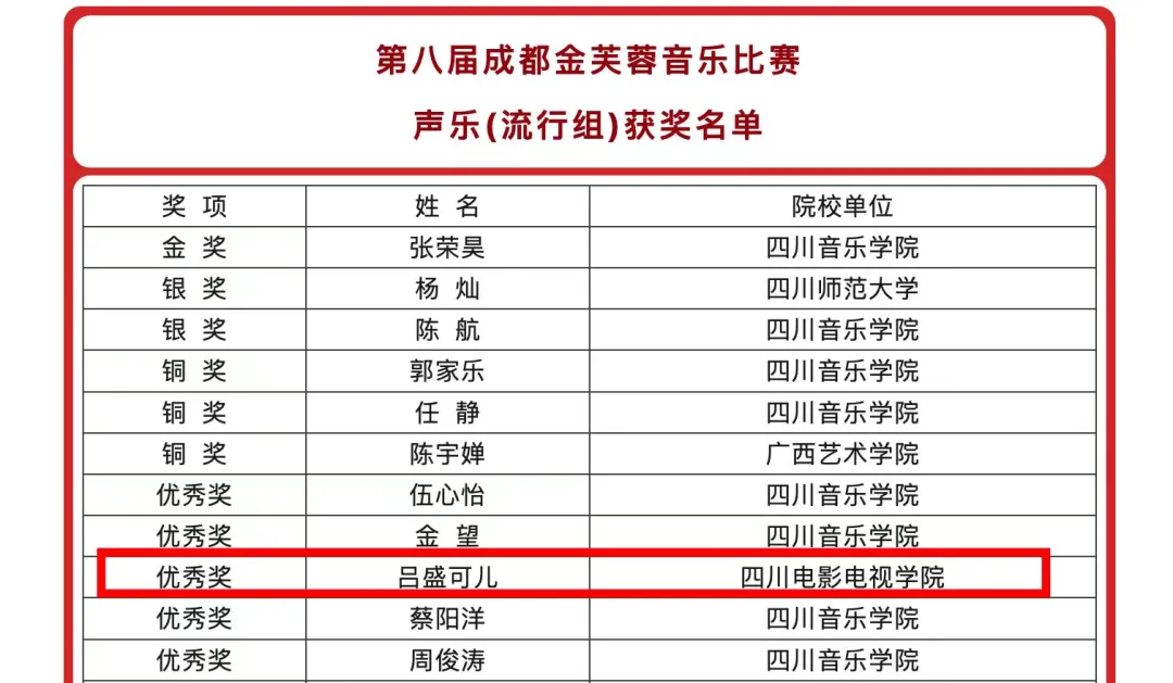 川影音乐学院青年教师龚寅甲荣获第八届成都金芙蓉音乐比赛美声(专业组)金奖,青年教师郑文婷荣获民族(专业组)银奖,青年教师吕盛可儿荣获声乐(流行组)优秀奖。