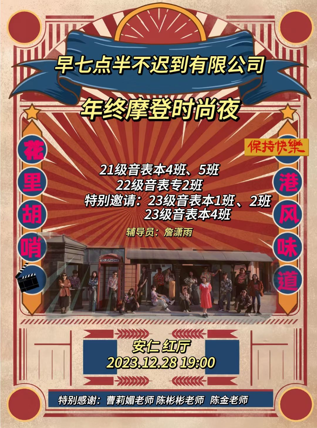 2023年12月28日,詹潇雨老师所带班级学风建设新年晚会在红厅如期举行。本次晚会主题为“重回90年代”,同学们大胆突破复古风格,在舞台上充满自信,大放异彩。学院党委副书记贺贝,学工负责人,辅导员老师们参加了此次活动。