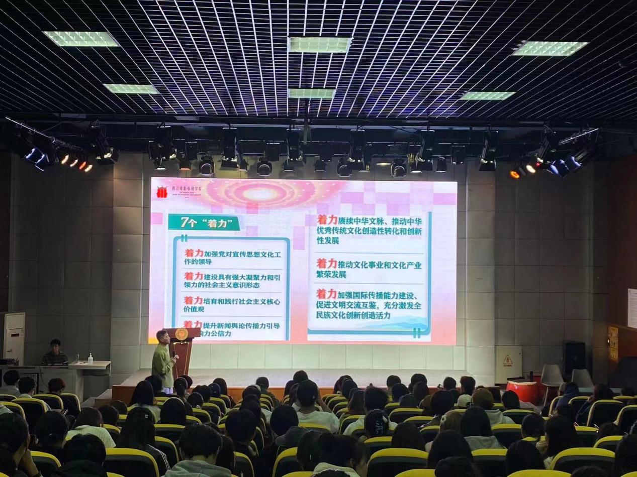 学院学工负责人翟凯乐老师带领同学们学习了习近平总书记对宣传思想文化工作作出的重要指示精神,总书记的宣传文化思想内涵丰富、视野宏阔、论述深刻,为我们做好新时代新征程宣传思想文化工作进一步指明了方向、提供了方法、凝聚了力量。