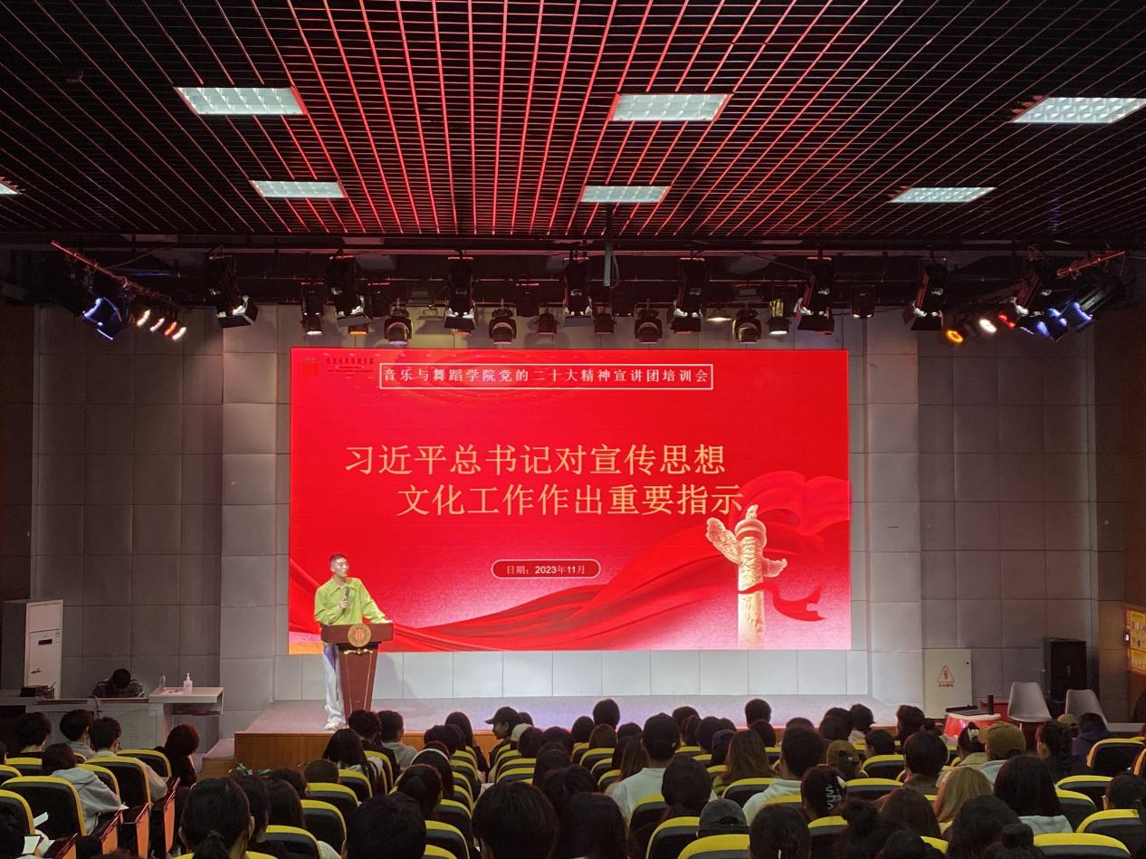 为全面落实立德树人根本任务,深入贯彻落实习近平总书记关于加强思政课建设的重要指示精神和上级工作部署要求,切实推进党的二十大精神入脑入心入行。2023年11月7日 晚7点在金厅召开了音乐与舞蹈学院思政进晨练宣讲团培训会。音乐与舞蹈学院全体党员、入党积极分子、宣讲团成员参加了本次专题培训会议。