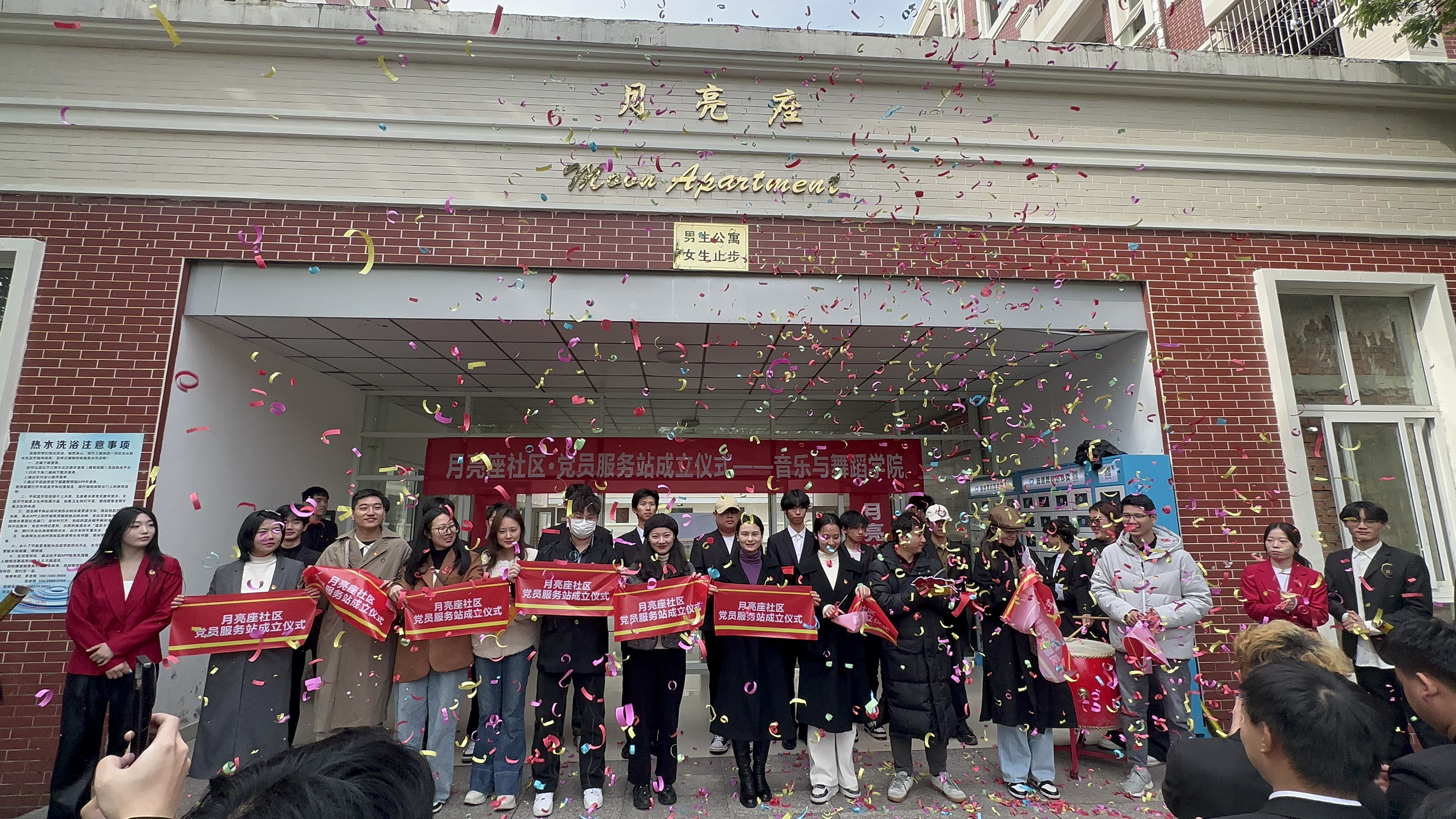 在锣鼓声中,老师们一同为月亮座社区成立剪彩。社区负责老师共同表示:今后我们会不断落实建立心灵驿站、文化长廊及各类生活服务区,提高学生校园生活的归宿感和幸福感。相信我们月亮座社区的建设在老师同学们的努力之下能够越来越好,共创和谐幸福的生活环境。