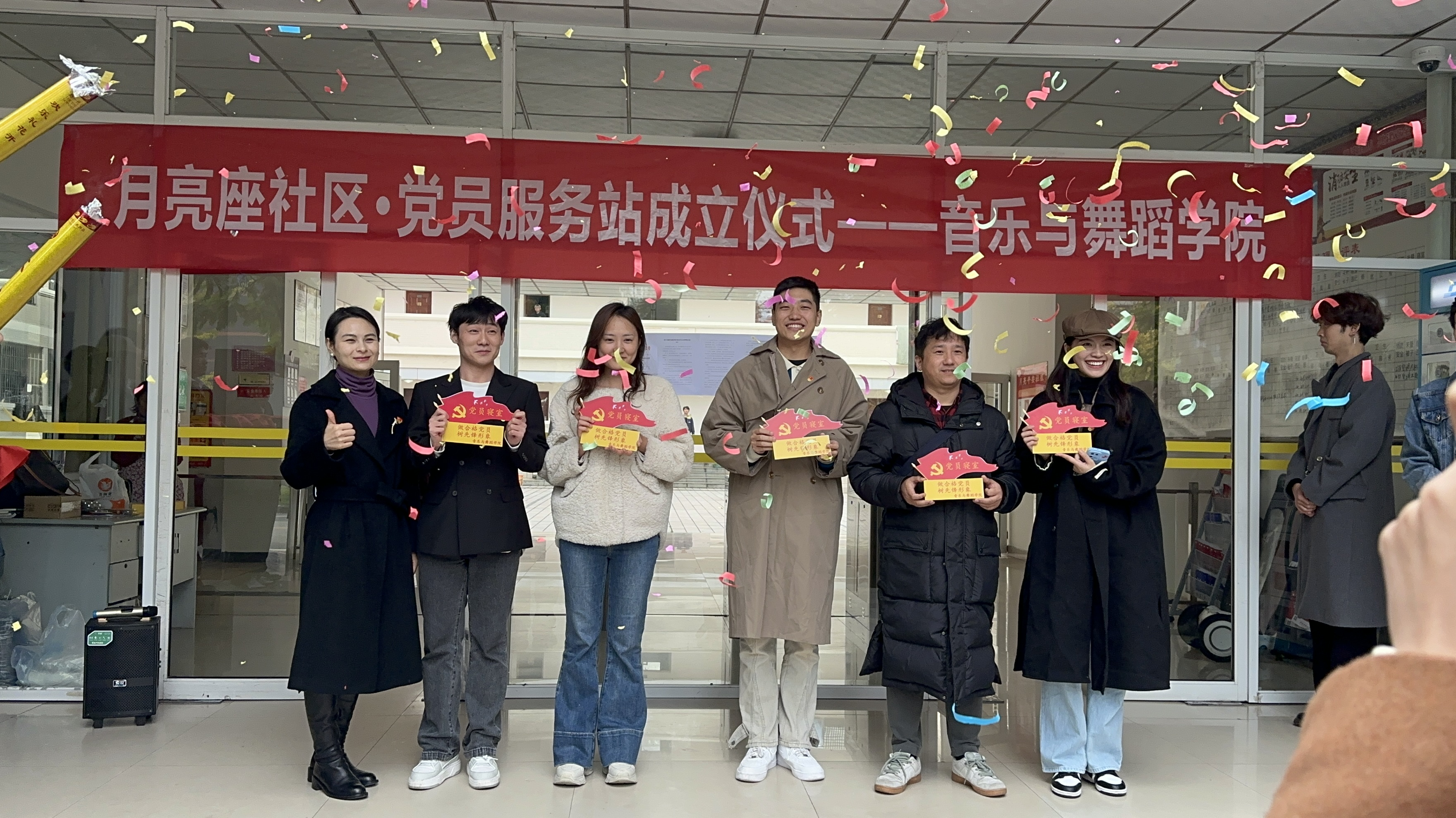 本次成立仪式宣布了社区部门分工及负责人,并为党员寝室授牌。他们分别是社区一楼及办公室负责人翟凯乐老师,社区二楼及办公室负责人詹潇雨老师。社区三楼及宣传部负责人杜雨老师,社区四楼及组织部负责人宋君老师。五楼负责人学生党员王强,六楼负责人学生党员卿云豪。