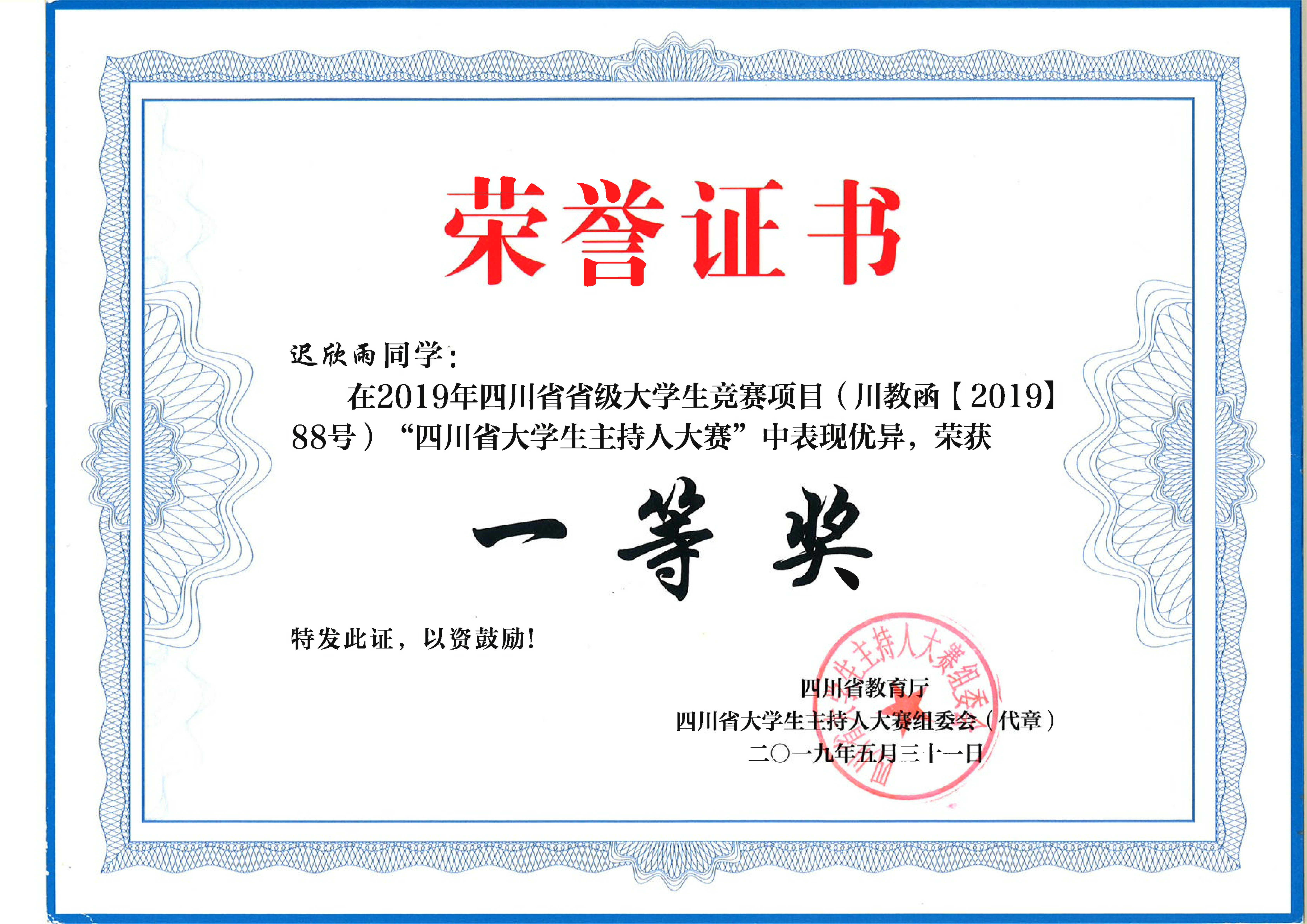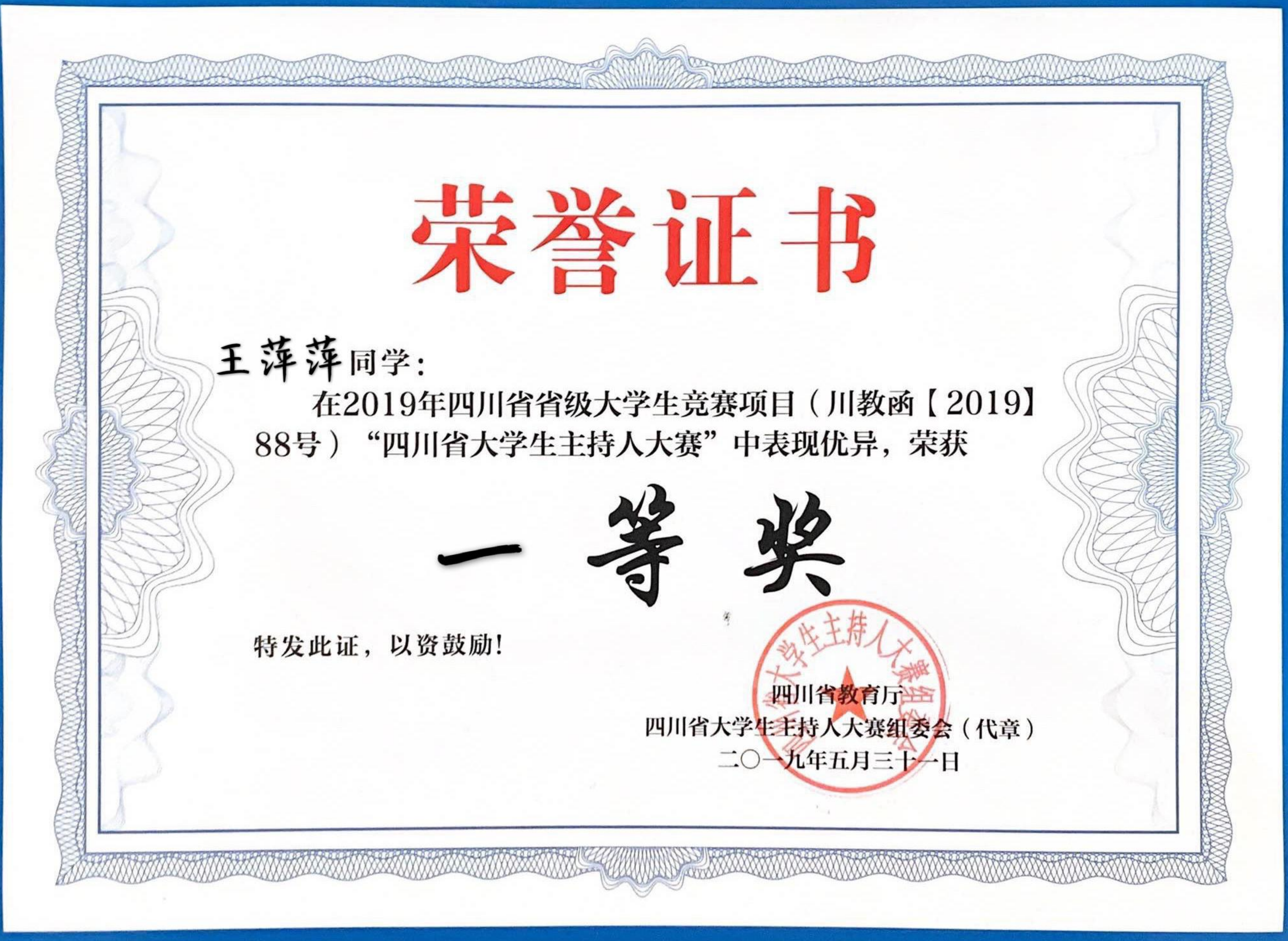 我院学生王萍萍,在2019年四川省省级大学生竞赛项目“四川省大学主持人大赛”中表现优异,荣获一等