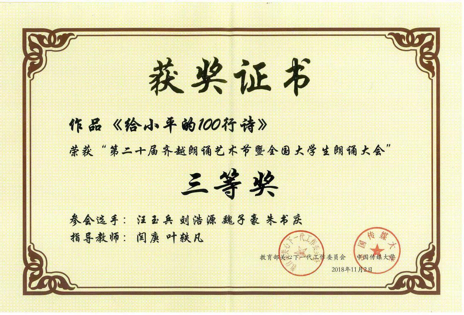 第21届齐越朗诵艺术节暨全国大学生朗诵大会为庆祝中华人民共和国成立70周年,以“弘扬爱国主义精神·诵读中华经典篇章”为主题。让在校大学生、一线媒体校友和朗诵艺术家们同台,以有声语言的独特魅力,弘扬民族精神,传承中华优秀传统文化。我院学生赵泉胜、刘恒、汪玉兵、邱选丰在本次大赛在荣获了三等奖