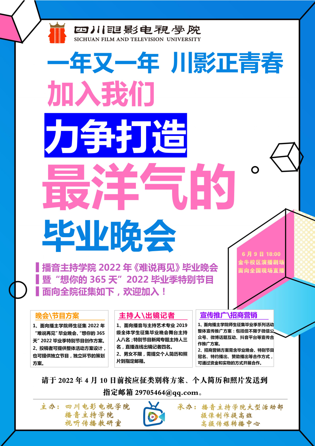 播音主持学院2022年《难说再见》毕业晚会暨“想你的365天”2022年毕业季特别节目面向全院征集如下,欢迎加入!一、征集时间即日起到2022年4月10日。二、征集范围1.晚会\节目方案面向全体播音主持学院师生。2.宣传推广\招商营销面向全体播音主持学院师生。3.主持人\出镜记者面向播音与主持艺术专业2019级全体学生。三、征...
