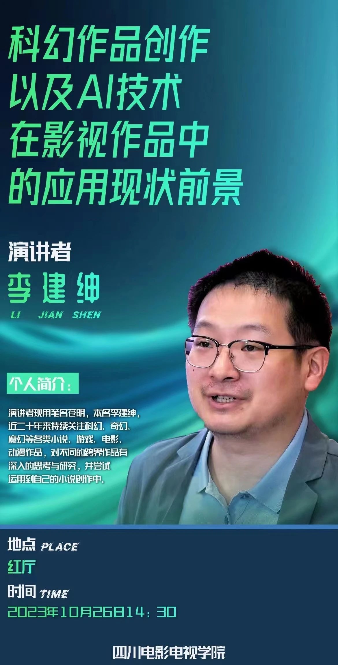 2023年10月26日,跨界艺术科幻作家李建绅(笔名苍明)应澳门网投唯一官网电影学院邀请,在红厅以《科幻作品创作以及AI技术在影视作品中的应用现状与前景》为主题进行了演讲。