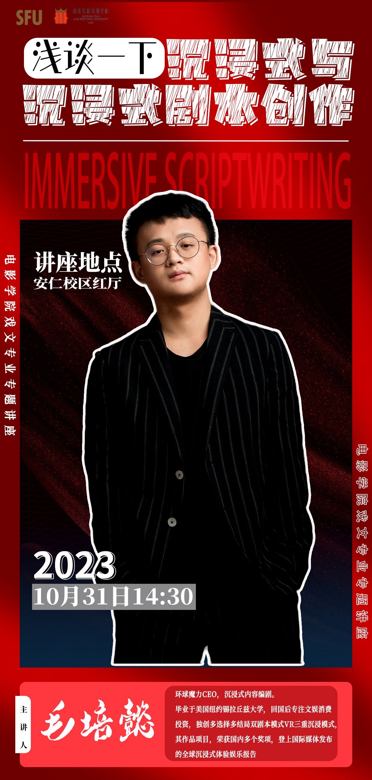 10月31日下午,沉浸与沉浸式剧本创作讲座在我校贡院大剧院红厅举行,本次讲座特邀到环球魔力创始人毛培懿为大家分享沉浸与沉浸式剧本创作经验,以理论与实践相结合的形式为学生带来学与用的综合训练。