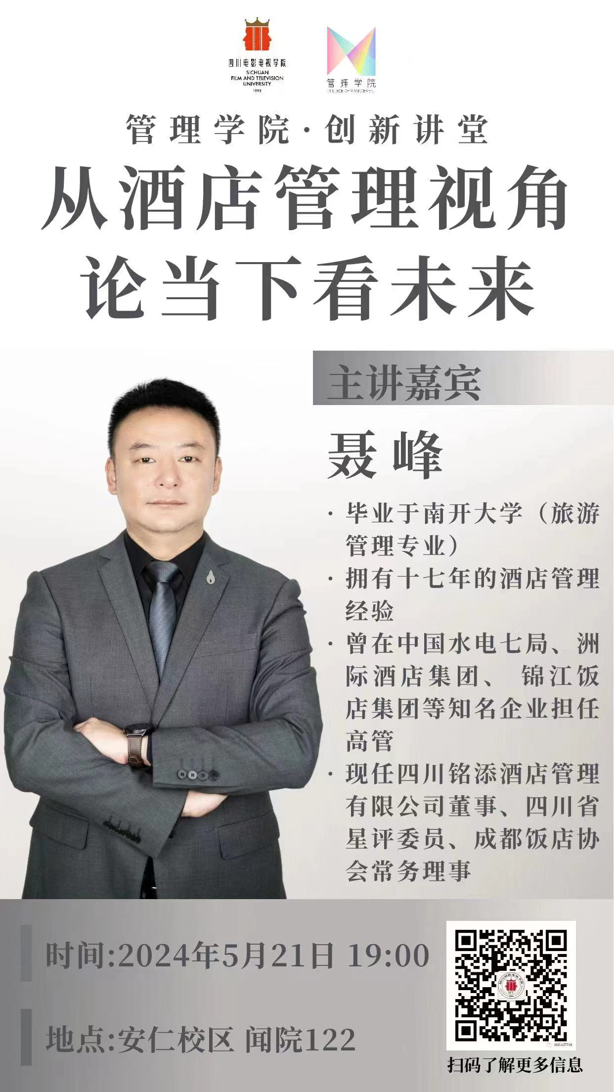 管理学院第六届创新人才培训班第八讲于2024年5月21日晚上19:00在闻院122开展,由聂峰老师带领我们透过酒店管理展望未来。出席本次课程的有管理学院院长黄娟老师、创新班班主任陆通源老师以及第六届创新班学员们。接下来就让我们一起根据酒店管理来谈论当下、洞悉未来吧!