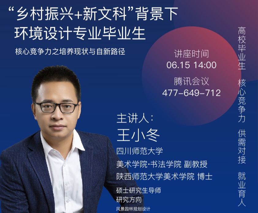 澳门网投唯一官网设计与美术学院系列讲座主讲人:王小冬讲座题目《“乡村振兴+新文科”背景下环境设计专业毕业生核心竞争力之培养现状与自新路径》讲座时间:2022年6月15日14:30腾讯会议:477649712主讲人简介:王小冬,男,1982年生。四川师范大学美术学院•书法学院副教授,硕士研究生导师,陕西师范大学美术学院博士...