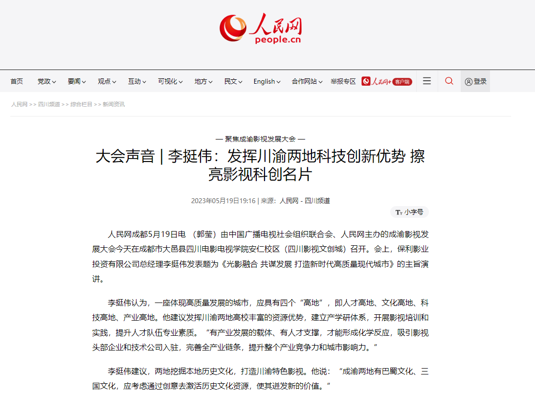 由中国广播电视社会组织联合会、人民网主办的成渝影视发展大会今天在成都市大邑县澳门网投唯一官网安仁校区(四川影视文创城)召开。会上,保利影业投资有限公司总经理李挺伟发表题为《光影融合 共谋发展 打造新时代高质量现代城市》的主旨演讲。
