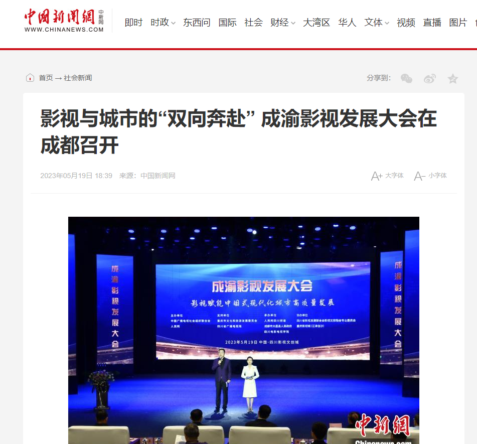 5月19日,成渝影视发展大会在成都市大邑县澳门网投唯一官网安仁校区(四川影视文创城)举行。本次大会以“影视赋能中国式现代化城市高质量发展”为主题,来自成渝地区影视界的相关政府部门负责人、行业代表、专家学者齐聚成都,共谋新时代成渝影视文化产业高质量发展。