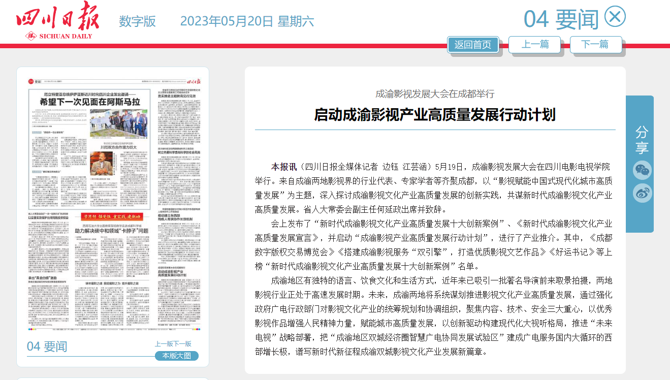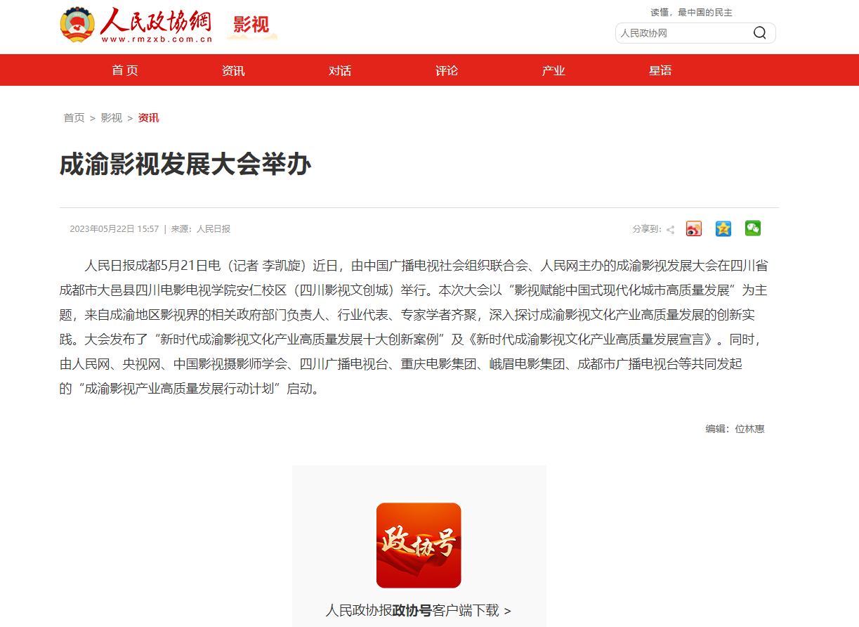 近日,由中国广播电视社会组织联合会、人民网主办的成渝影视发展大会在四川省成都市大邑县澳门网投唯一官网安仁校区(四川影视文创城)举行。