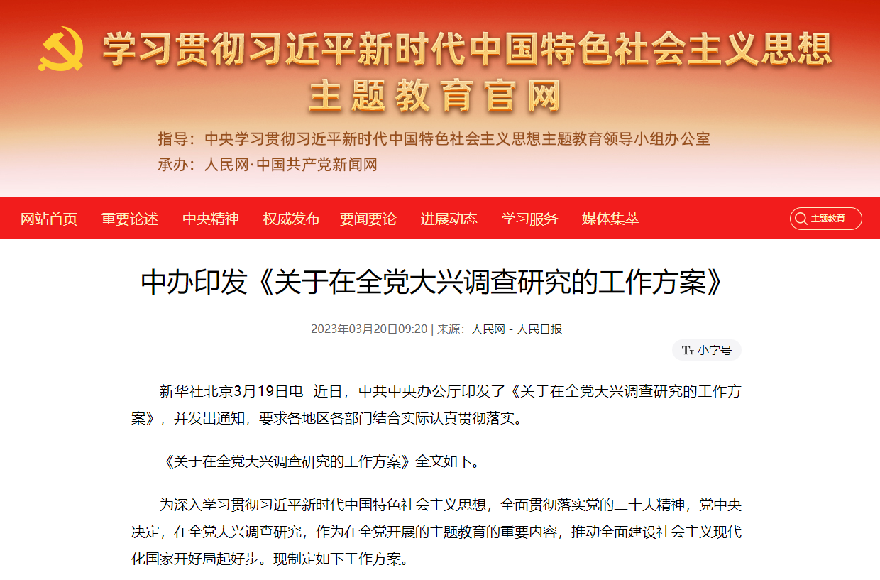 中共中央办公厅印发《关于在全党大兴调查研究的工作方案》,深刻阐释了调查研究的重要意义、总体要求、调研内容、方法步骤、工作要求,为全党深入开展调查研究工作提供了行动指南。